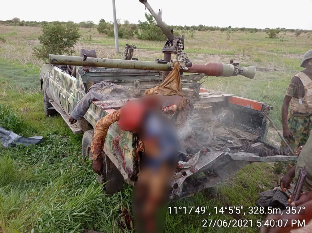 Troops of 152 Task Force Battalion in conjunction with the Air Component of Operation HADIN KAI on Sunday, 27 June, 2021 dealt a devastating blow on marauding Boko Haram (BHT) and Islamic State West Africa Province (ISWAP) while attempting to infiltrate the Forward Operational Base at Bula Yobe in Borno State.